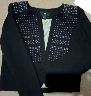 укороченный женский жакет черного цвета от бренда H&M. Жакет без воротника и без видимой застежки спереди.